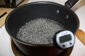 7. Meanwhile, reduce the stove top temperature slightly or take the pot off direct heat to bring the sugar mixture back down to 235F.