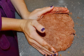 5. Dust the counter with cocoa powder and turn the dough out onto it. Finish gathering it together, knead it slightly into a ball, and then gently pat it out into a square.